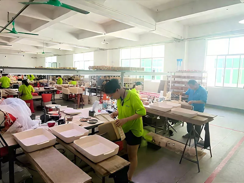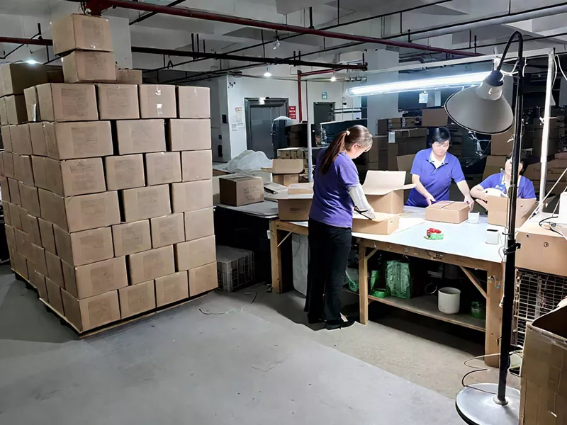За да улесним опаковките и доставката, ние създадохме собствен център за опаковане близо до централата си в Донгуан. Този център е специализиран в опаковъчни решения за крехки предмети като стъклени свещници и дифузори. Можем да създаваме по поръчка кутии и облицовки и използваме екологични материали, за да защитим предмети като стъклени дифузори и декоративна керамика, като гарантираме тяхната безопасност по време на транспортиране.