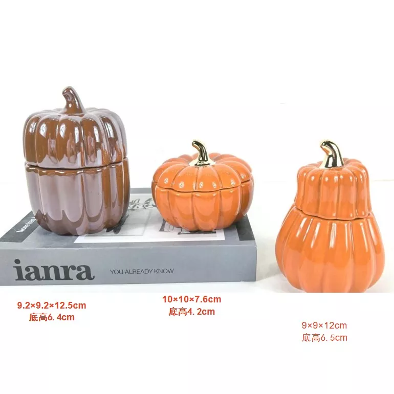 Хелоуин тиквени керамични орнаменти: бурканите са реалистично и артистично изработени, за да възпроизведат естествения оттенък на тиквата. Бурканите се предлагат в тъмнокафяв и ярко оранжев, подражаващ на естествения цвят на тиквата и разполагат с метален капак и копче за изискано и привличащо вниманието покритие.