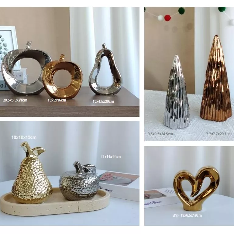 Специалните керамични декори на BYF разполагат с плодове, коледни елхи и сърца. Изработени от керамика, те използват уникална техника за създаване на метален блясък, предлаган в злато и сребро. Плодовите дизайни (ябълка и круша) разполагат с гладки линии, с уникални изрези и текстури; Коледното дърво е триизмерно, с богати текстури; А сърцето е просто и елегантно, придавайки нотка на романтика. Тези елегантни, светло-луксозни парчета са идеални за вашата всекидневна или маса, добавяйки нотка на художествен усет и стил към вашия дом. Те са изискани аксесоари, които подобряват атмосферата на всяко пространство.